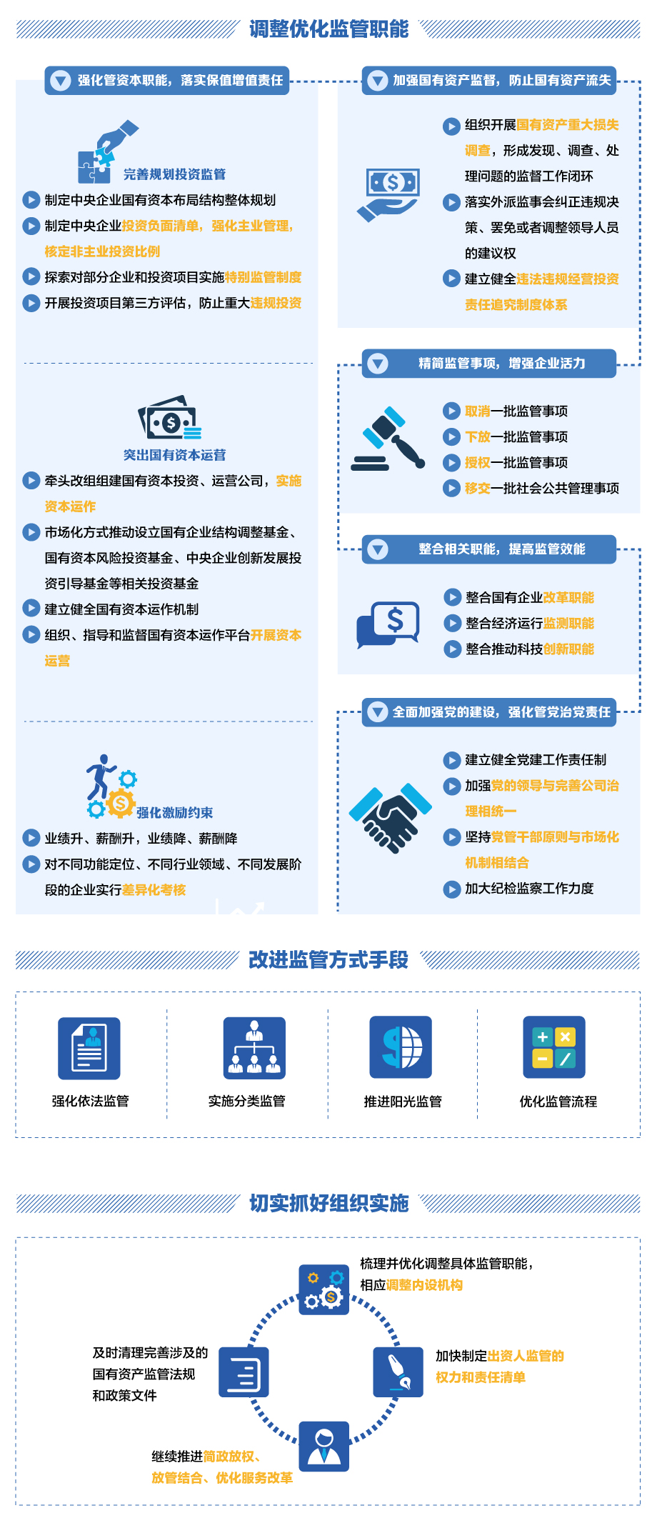 | 黨的十八大以來,國務(wù)院國資委認(rèn)真貫徹落實黨中央、國務(wù)院關(guān)于深化國有企業(yè)改革的決策部署,準(zhǔn)確把握國有資產(chǎn)監(jiān)管機構(gòu)的出資人代表職責(zé)定位,堅定不移深化國有企業(yè)改革,探索完善國有資產(chǎn)監(jiān)管體制機制,積極推進國有企業(yè)結(jié)構(gòu)調(diào)整、創(chuàng)新發(fā)展,為實現(xiàn)國有資產(chǎn)保值增值、防止國有資產(chǎn)流失、發(fā)展壯大國有經(jīng)濟作出了積極貢獻(xiàn)。但與此同時,國有資產(chǎn)監(jiān)督機制尚不健全,國有資產(chǎn)監(jiān)管中越位、缺位、錯位問題依然存在,亟需加快調(diào)整優(yōu)化監(jiān)管職能和方式,推進國有資產(chǎn)監(jiān)管機構(gòu)職能轉(zhuǎn)變,進一步提高國有資本運營和配置效率。4月27日,國務(wù)院辦公廳轉(zhuǎn)發(fā)《國務(wù)院國資委以管資本為主推進職能轉(zhuǎn)變方案》,明確提出調(diào)整優(yōu)化國資監(jiān)管職能,改進監(jiān)管方式手段,著力提高國有資本效率,增強國有企業(yè)活力。文件還明確了精簡的國資監(jiān)管事項共43項。 |