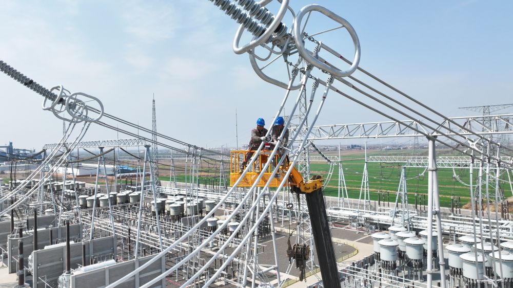 在施工現(xiàn)場,天津送變電公司員工進行1000千伏引線間隔棒安裝工作。新華社發(fā)