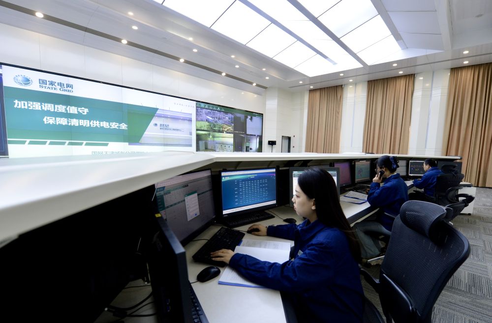 天津城東公司調(diào)度值班人員在監(jiān)測區(qū)域電網(wǎng)運行狀態(tài)。新華社發(fā)