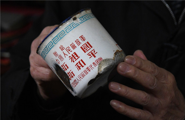 多年來,他只是小心翼翼地,把1954年“全國人民慰問人民解放軍代表團”頒發(fā)的一個搪瓷缸,擺在觸手可及的地方。這只補了又補、不能再用的缸子上,一面是天安門、和平鴿,一面寫著:贈給英勇的中國人民解放軍——保衛(wèi)祖國、保衛(wèi)和平。