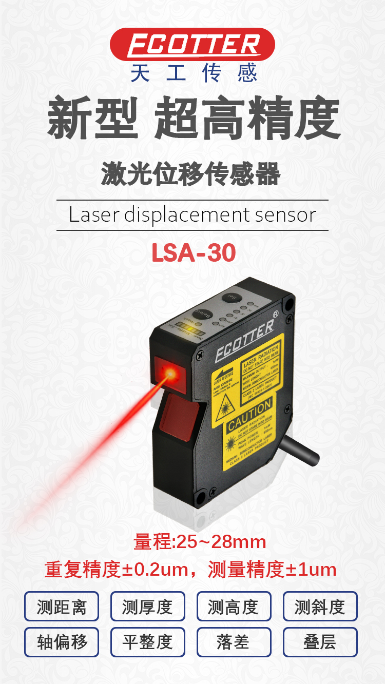 ECOTTER 新型 超高精度激光位移傳感器 LSA-30 是一種利用激光技術(shù)進(jìn)行測量的傳感器,它能夠非接觸地精確測量被測物體的位置、位移等變化,LSA-30 的量程:25~28mm,重復(fù)精度:±0.2um,線性度精度:±1um。