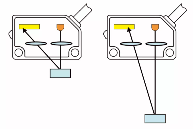 如下圖,物體在距離傳感器不同的位置,反射光線(xiàn)照在受光元件的位置也不同。